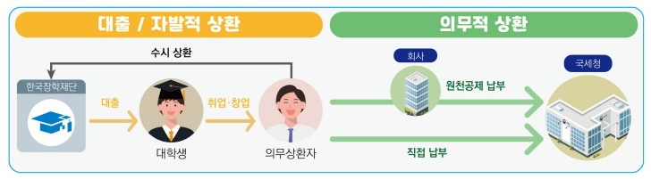 의무상환은 일하고 있는 회사에서 원천공제 납부 후 급여로 받는 방식이며, 자발적 상환은 본인의 상황을 고려해 자신에게 맞는 방법으로 상환하는 방식을 말해요.