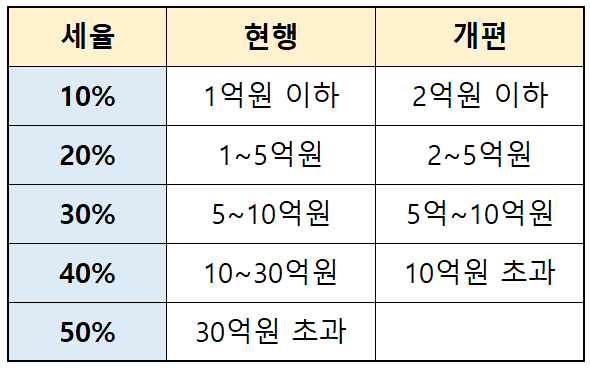 또한 현행 최고요율인 50% 구간은 폐지되며 최고세율 적용구간이 10억 원 초과로 조정됩니다.
