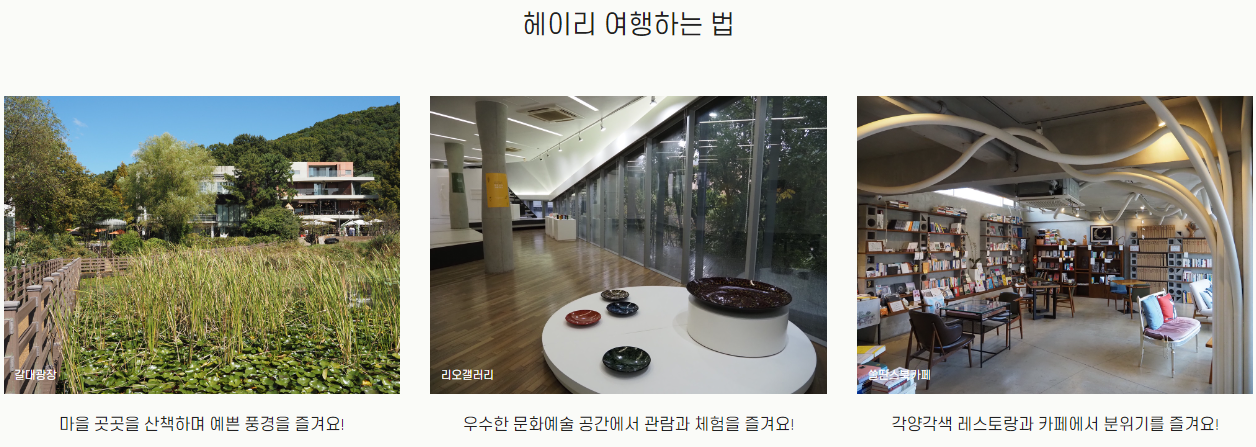 헤이리 예술마을에서는 홈페이지를 통해 파주 헤이리 예술마을의 지도, 여행하는 방법, 박물관/미술관 정보 등 다양한 정보 제공도 하고 있으니 홈페이지를 통해 어디를 방문하면 좋을지 먼저 확인한 뒤 방문하는 것을 추천드립니다.
