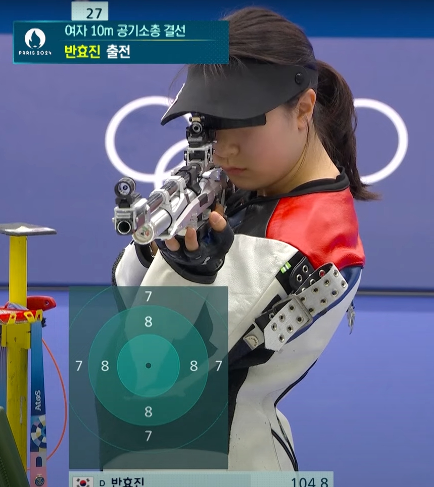 반효진 선수의 경기 초반까지는 10점 이하를 쏘지 않으며 선두를 유지했고 경기 중반부에 10.9점의 만점을 쏘며 1위 황위팅 선수와 1.3 점차까지 점수를 벌렸습니다.