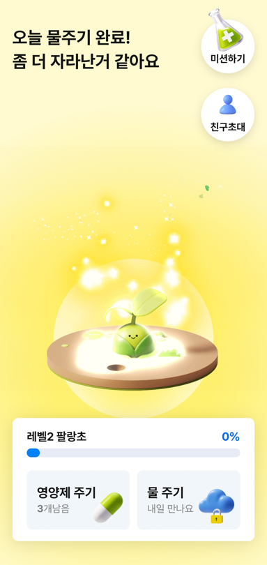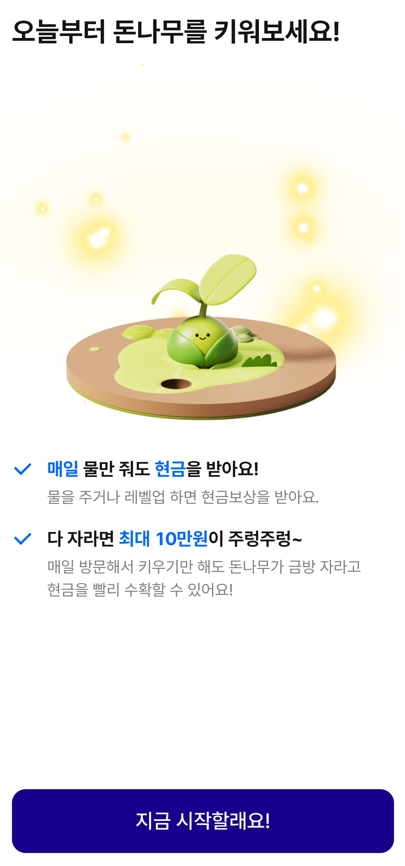 '돈나무 키우기 시작' 버튼을 눌러주시면 돈나무에 물을 주고 미션 할 수 있게 나의 돈나무가 생성됩니다.