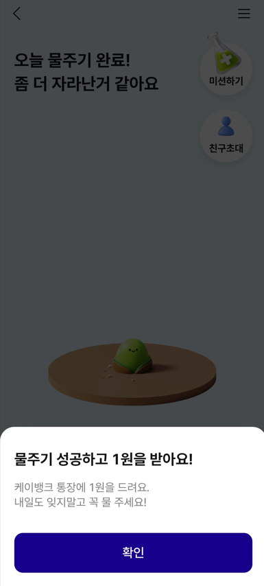물을 줄 때마다 1원씩 보유한 케이뱅크 계좌로 지급됩니다. 하루 1번 물 주기가 가능합니다.