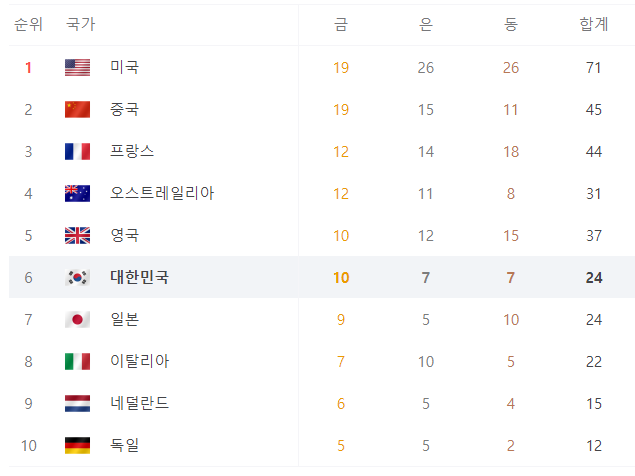 8월 5일 오전 9시 기준 대한민국 순위는 현재 6위입니다.
