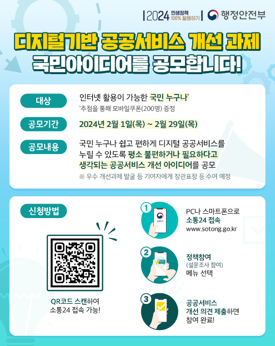 ✅ 공모참여 : PC나 스마트폰으로 소통24 접속 (https://www.sotong.go.kr) → '디지털기반 공공서비스 개선을 위한 아이디어 공모' 조사에 의견 제출