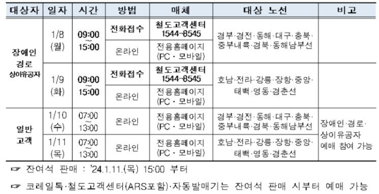 ✔ 예매대상 : 2024. 2. 8(목) ~ 2024. 2. 12(월)까지 운행하는 KTX, ITX, 무궁화, 새마을