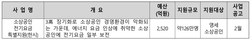 이번 소상공인 전기요금 지원은 한시적 특별지원 항목이므로 2월 중 신청/접수에 관한 내용이 게시될 예정입니다.